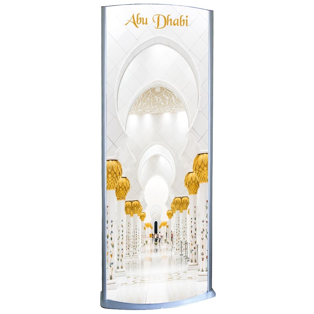 Lichtsäule mit silber lackiertem Sockel und Oberteil, 36 mm silber eloxierten Aluminium-Klappenprofilen und 1 mm APET-Antireflex-Frontplatten. 230V. Nur für den Innengebrauch. Lieferung ohne Banner.