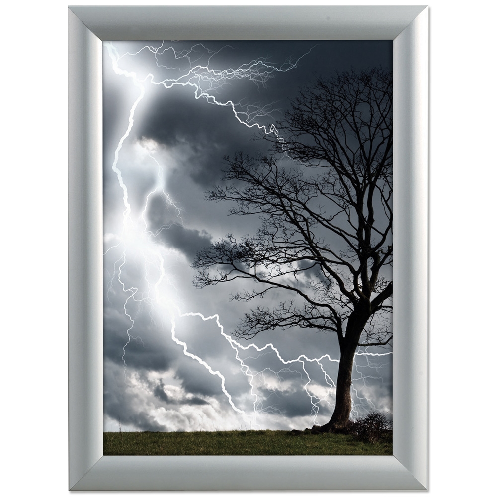 • Silbereloxierter Aluminium-Schnellwechselrahmen mit Gehrungsecken für einen stabilen und langlebigen Rahmen für Ihr Plakat.