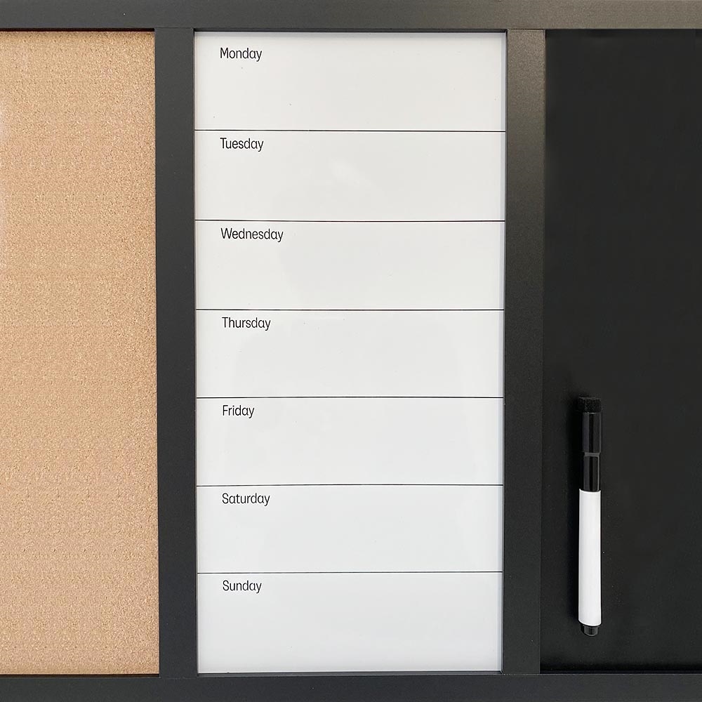 Whiteboard mit Wochenplaner, Korkwand und Kreidetafel