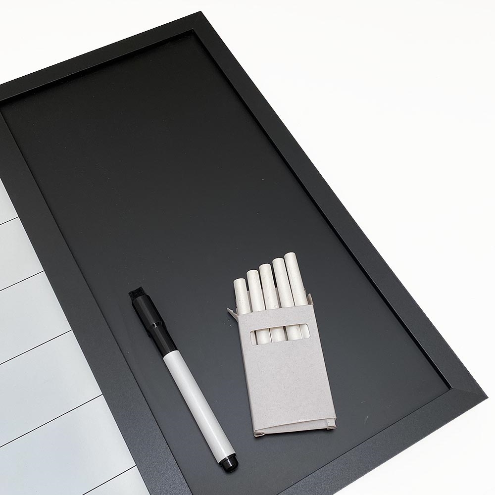 Whiteboard mit Wochenplan, Kork- und Kreidetafel, inkl. schwarzer magnetischer Marker, 4 x schwarze 20 mm Magnete, 12 schwarze Nadeln und 1 Packung Kreide (5 Stk.)