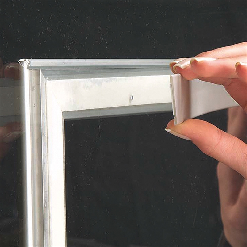Beidseitiger Klapprahmen mit Aluminiumprofil und Gehrungsecke und zwei APET-Antireflex-Frontplatten. Die beiden Poster werden sowohl im Innen- als auch im Außenbereich angezeigt (im Innenbereich wechseln). Das Profil wird innen auf das Fenster geklebt und die Zierleiste wird außen aufgeklebt (beides mit doppelseitigem Klebeband montiert).