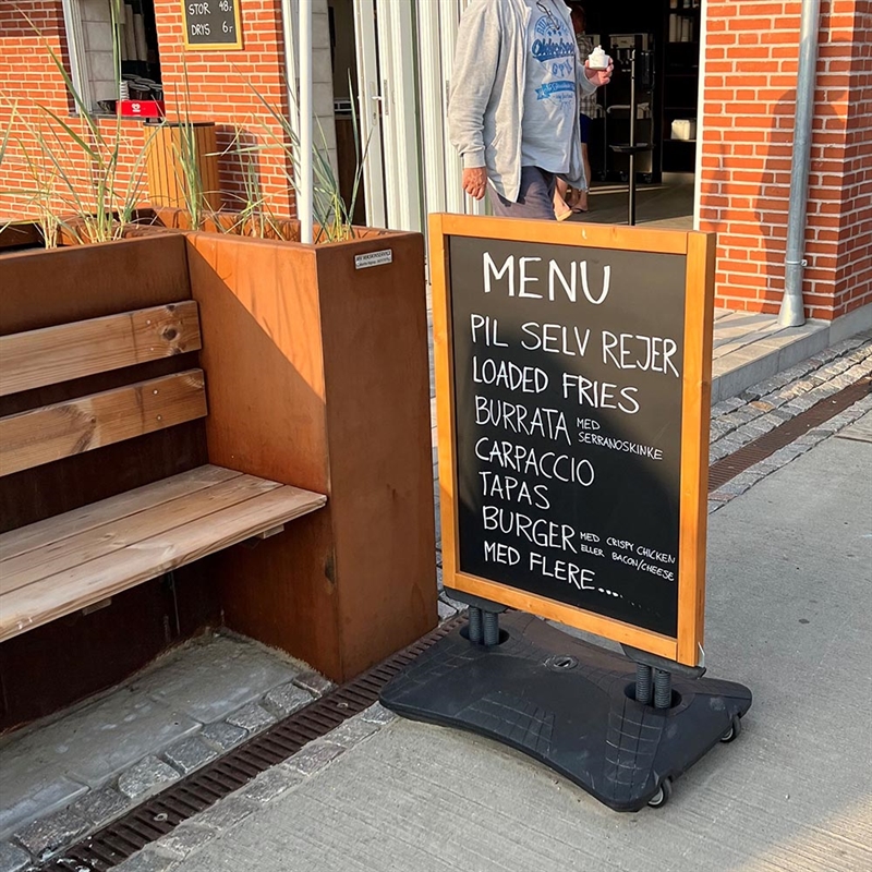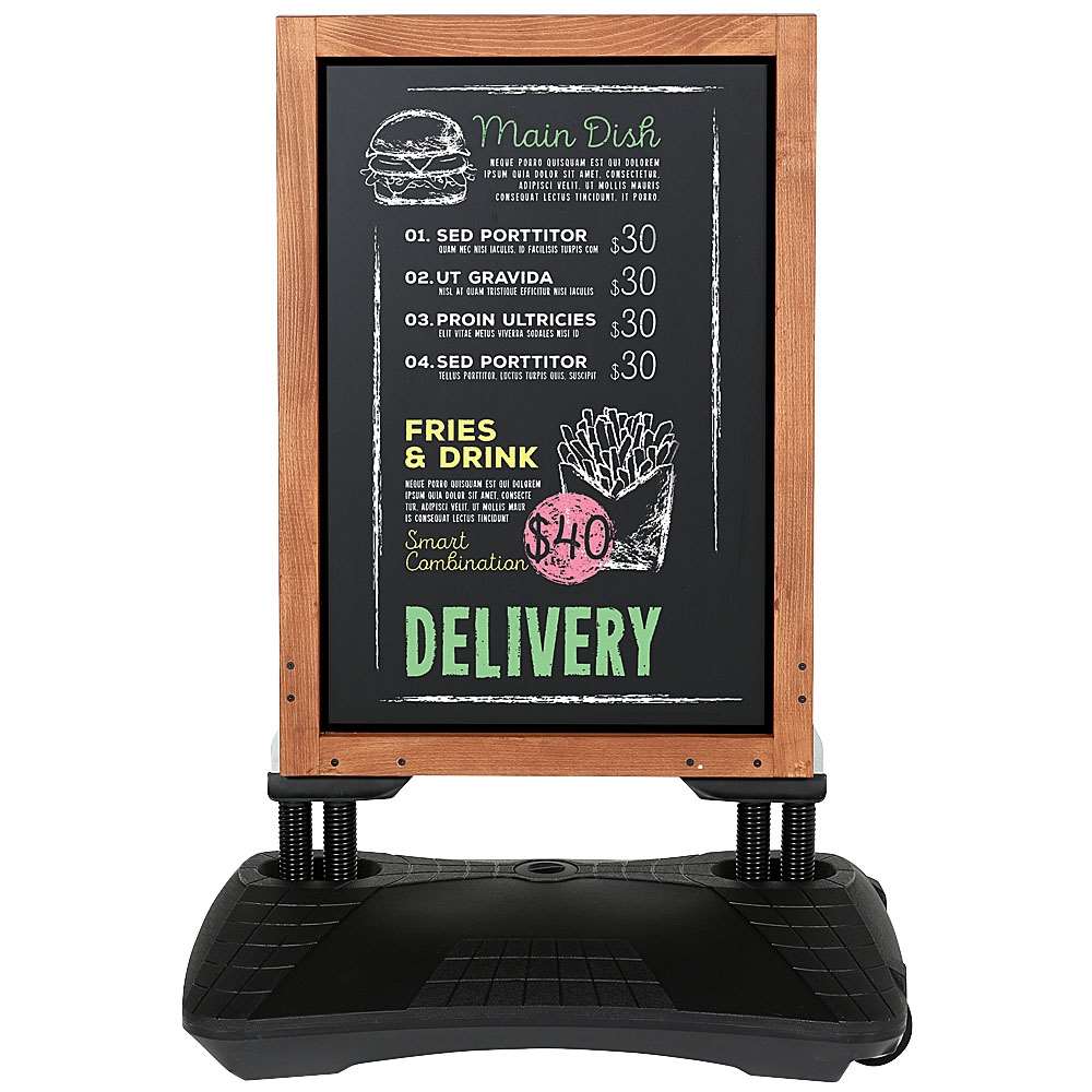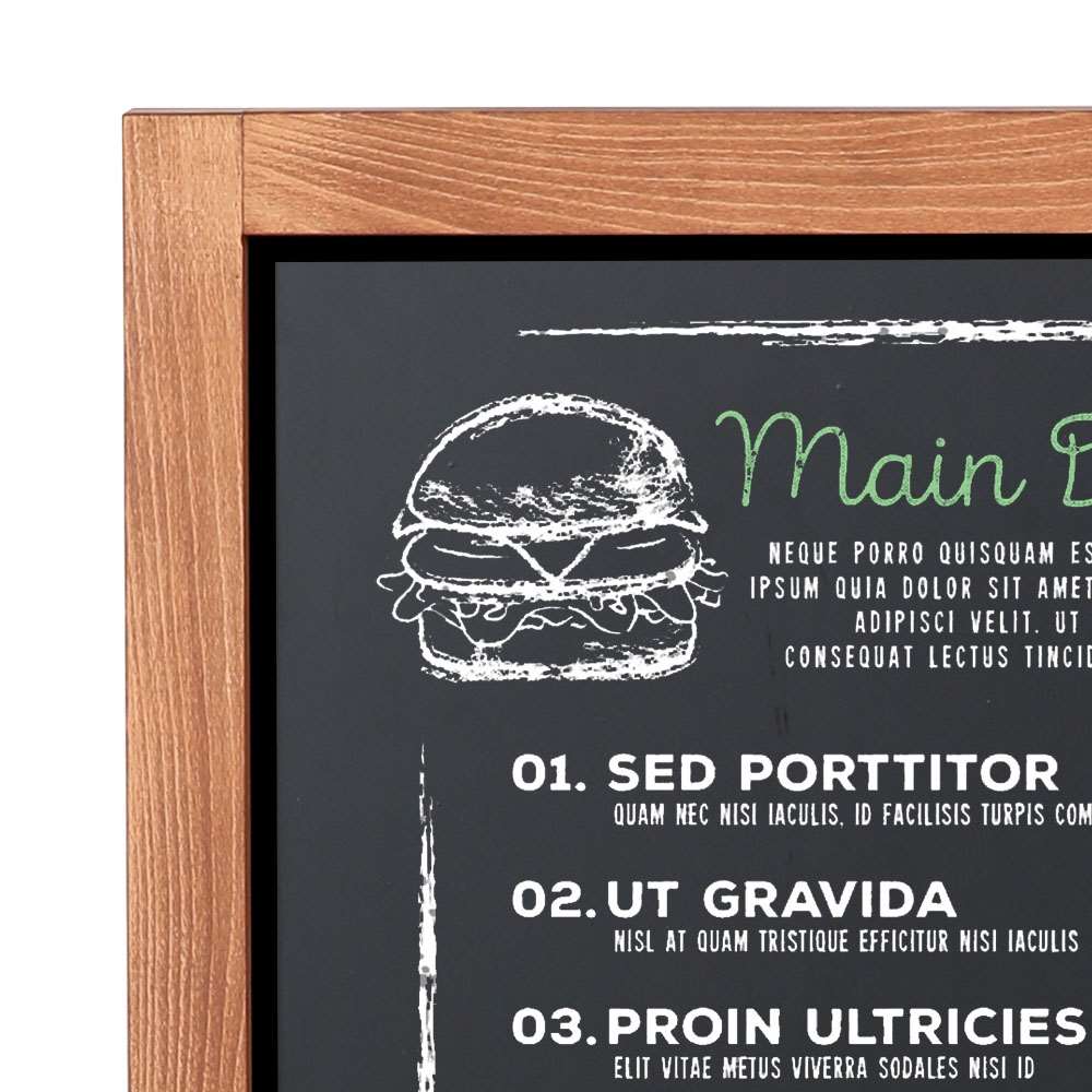 • Stabiles Kundenstopper mit schwarzen Stahltafeln und einem schönen dunkel gebeizten Holzrahmen-für den Innen- und Außenbereich geeignet.