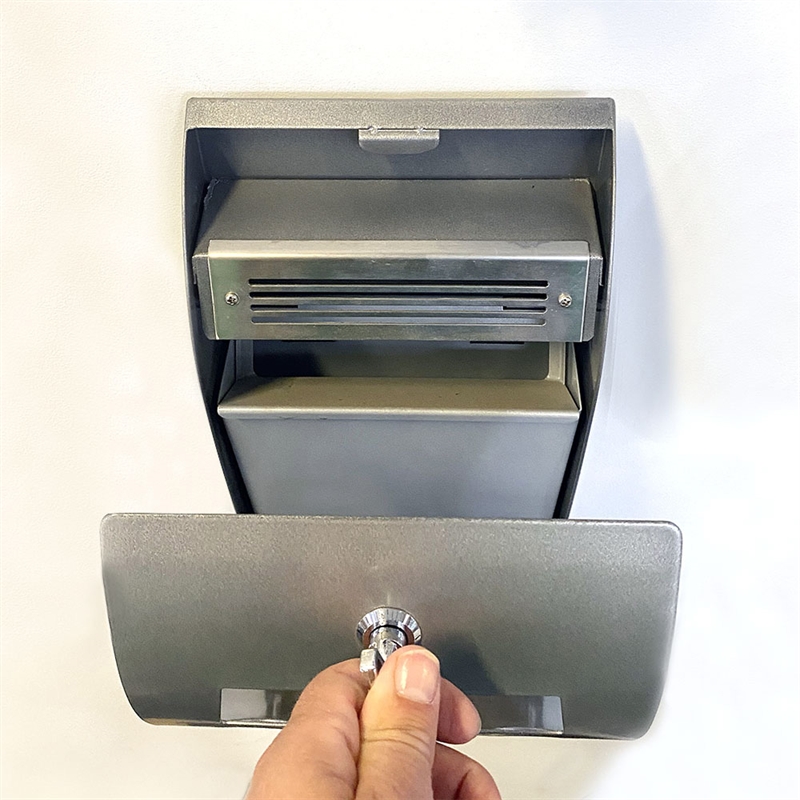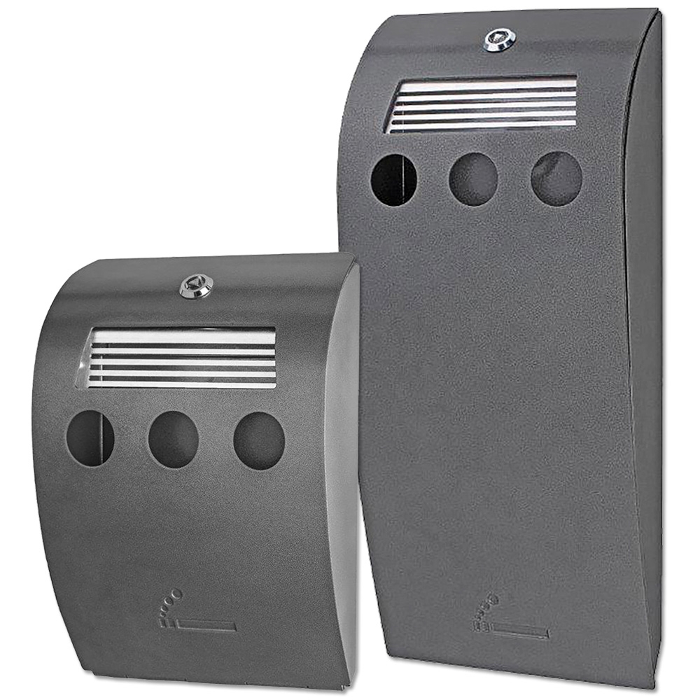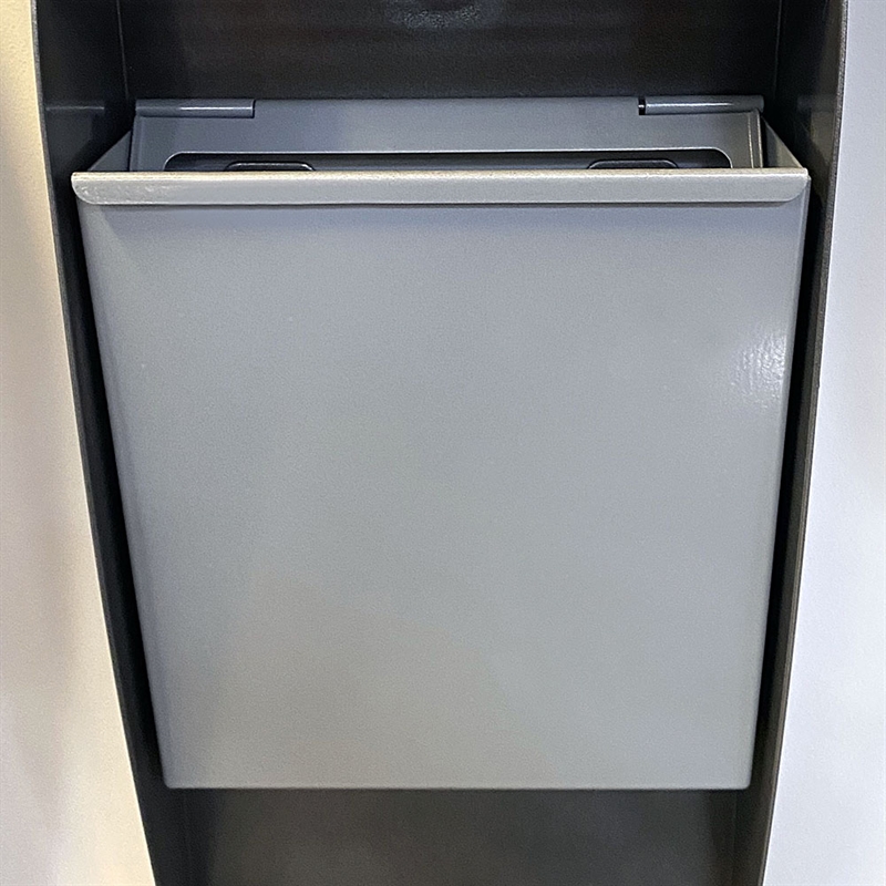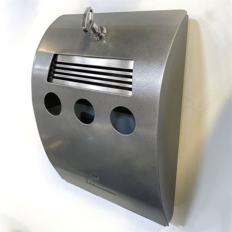 Aschenbecher in stilvollem Design zur Montage an Wand, Ständer oder Ständer. Aus verzinktem Stahl, mit gebogener Fronttür. Der Behälter verfügt über ein Schloss und lässt sich leicht entleeren.